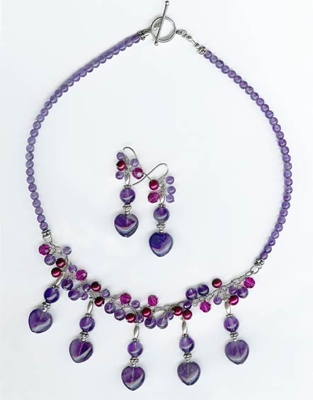 Item #0531 Purple Hearts Necklace Item #0433 Earrings Amethyst, Fresh Water Pearls, Swarovski Crystal, Sterling Silver Beads, Chain & Toggle Clasp. Length 16"